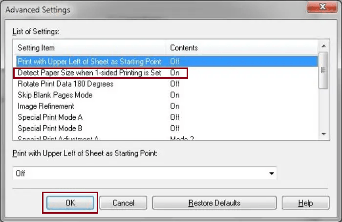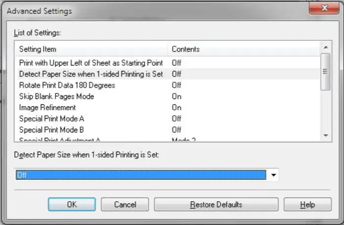 Chọn Mục: “Detect Paper Size when 1-sided print is set”. Tại đây bạn chuyển thiết lập từ ON sang OFF như hình bên dưới: