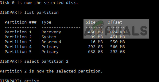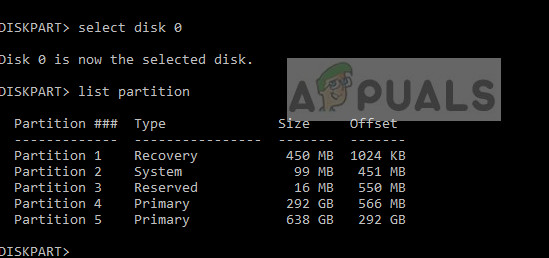 - Bây giờ chọn đĩa mà bạn đã cài đặt Windows. Trong trường hợp này, nó là ‘đĩa 0’. Thực hiện các lệnh sau: