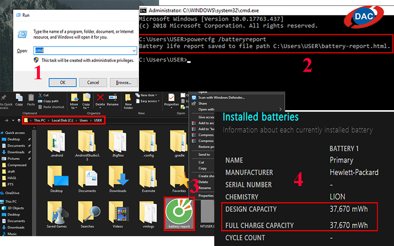 Bạn có thể kiểm tra độ chai pin bằng cách nhấn tổ hợp " Windows + R" rồi nhập dòng lệnh cmd. Khi cửa sổ mở ra, bạn nhập powercfg /batteryreport rồi nhấn phím Enter. Tìm địa chỉ được thông báo rồi mở tệp battery-report.html. Trang web hiện ra, bạn tìm đến danh mục Installed batteries: